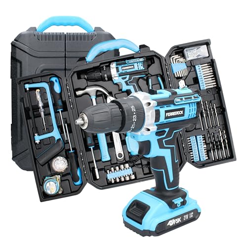Ferrestock Bricoset FSKTAB101PLUS Perceuse à percussion 21 V à batterie avec outils et accessoires pour la plupart des travaux ménagers avec boîte de rangement