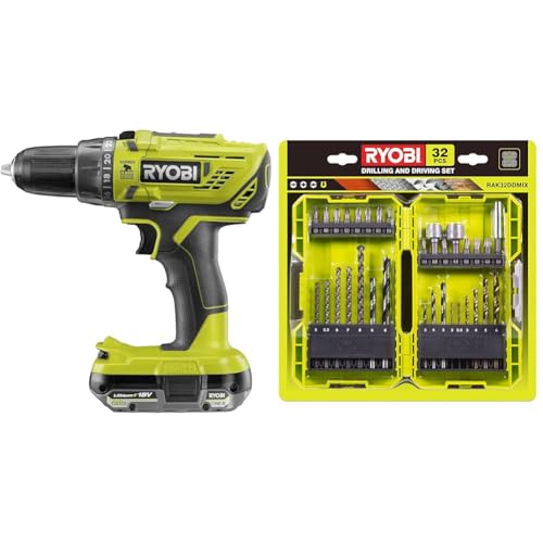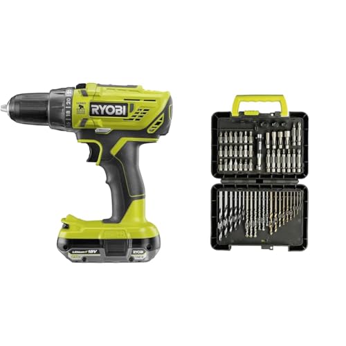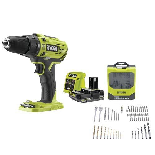 Ryobi - Perceuse-visseuse à percussion 18V - 2 vitesses - 50 Nm - mandrin 13 mm livrée avec 1 batterie 2Ah, chargeur, Coffret 69 Pièces (Vissage et Perçage) - R18PD32-1C20G69MIX