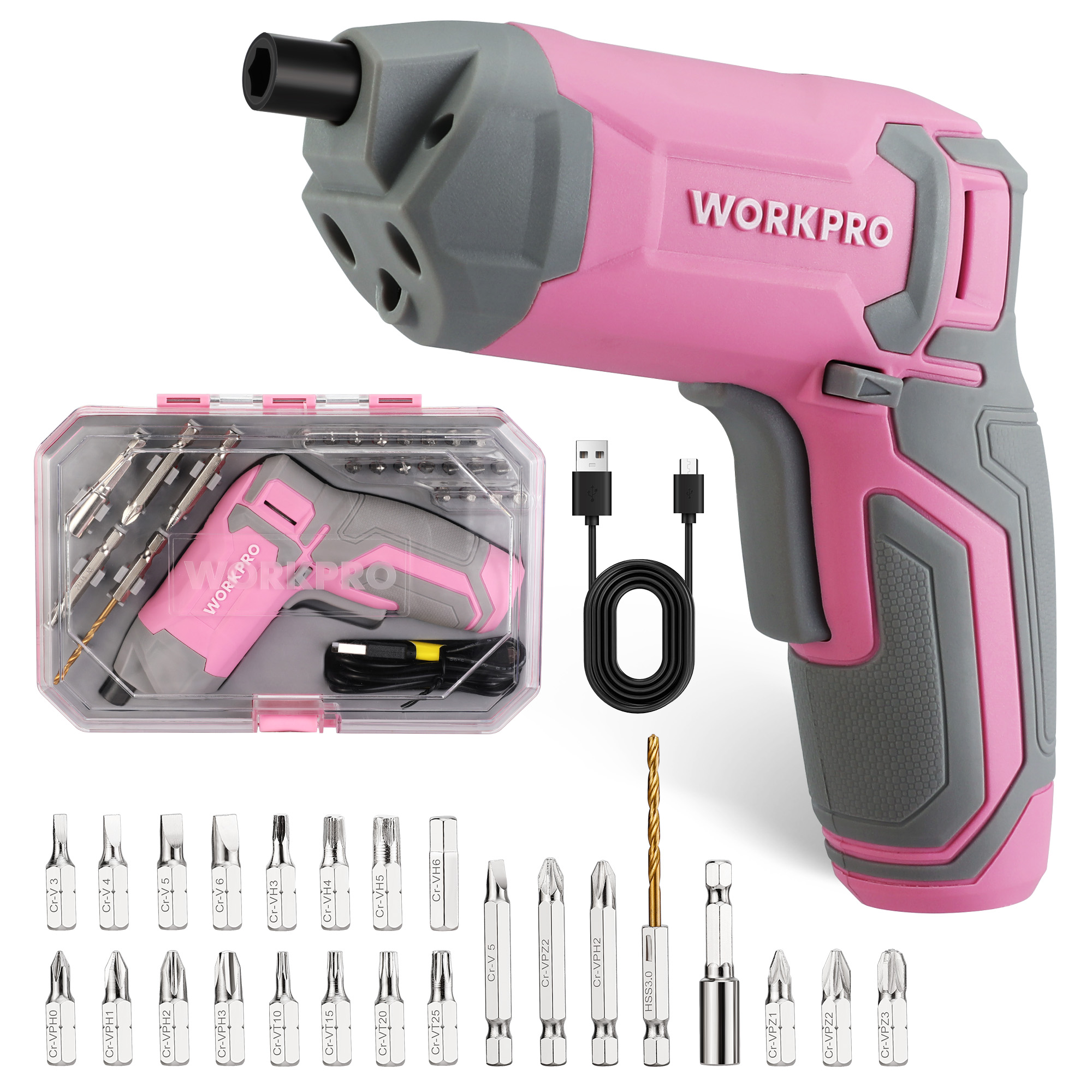 WORKPRO Perceuse Visseuse sans Fil 6Nm 3,6V, Visseuse Devisseuse Excentrique avec 21 Embouts, Barre d'Extension, Batterie 2000 mAh, Lumière LED, Câble USB-C, Boîte de Rangement, pour Bricolage, Rose
