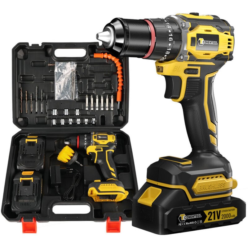 Perceuse Visseuse à percussion sans fil 21V Brushless Conentool 3 en 1, 52N.m Visseuse Devisseuse San Fil Multifonctionnelle avec 27Accessoires