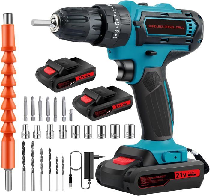 Perceuse Visseuse Devisseuse Sans Fil 21V avec 2x Batteries 45Nm 25+1 Réglages de Couple 2 Vitesse 26 Accessoires