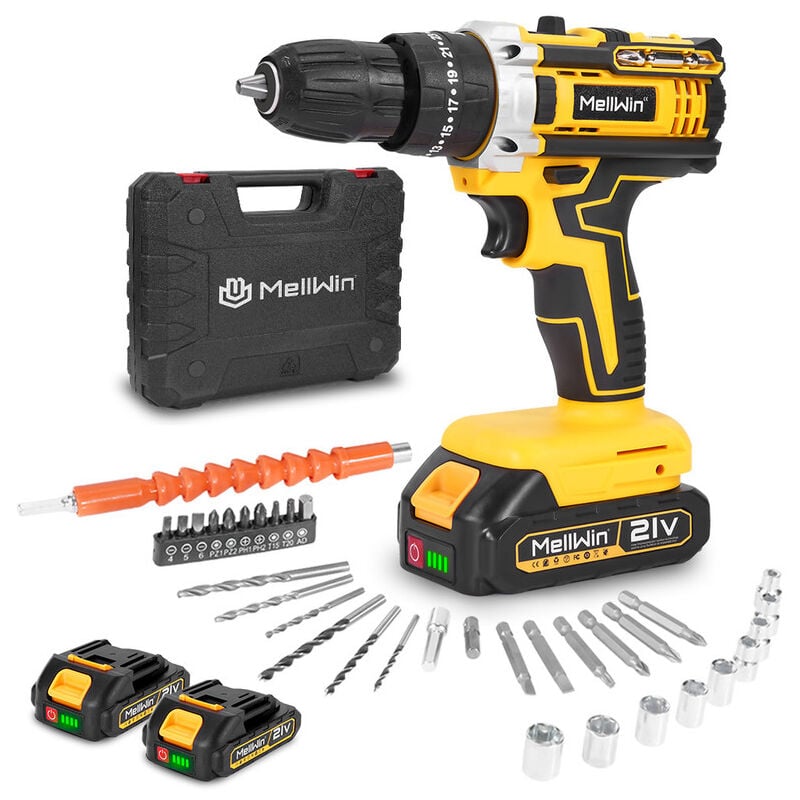 Perceuse Visseuse Sans Fil, 21V Visseuse Devisseuse avec 2 Batteries, 45Nm Perceuse Percussion, 25+1 Réglages de Couple, 10mm Métal Mandrin