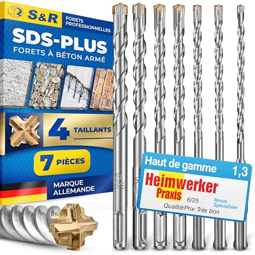 S&R Foret Beton SDS Plus. Coffret 7 Meche Beton sds pour Marteau Perforateur Bosch Hilti Metabo 5mm 6mm 8mm 10mm 12mm x 160. Forets sds 4 taillants Mur Maçonnerie Pierre