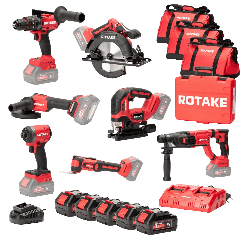 Ensemble de 7 machines ROTAKE 18V - Perceuse visseuse à percussion D2H + Meuleuse 125 + PERFORATEUR + Scie circulaire + Visseuse à chocs + Scie sauteuse + Outil multifonction - ROTAKE - avec 3 batteries 18V 5Ah + chargeur double + 3 sacs - LOT02