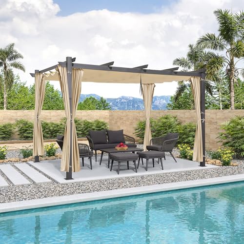 PURPLE LEAF Pergola Aluminium 4 x 3 m avec Rideau, Pergola Jardin Extérieur Toit Coulissante, Tonnelle de Jardin Tissu Teint en Fil, Kaki