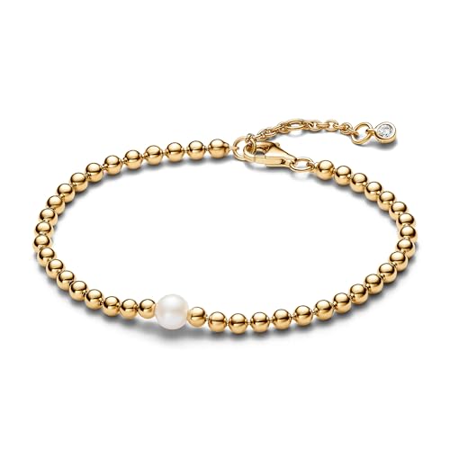 Pandora Timeless Bracelet Sphère en métal plaqué or 14 carats avec perle de culture d’eau douce traitée blanche et zircones cubiques transparentes, 18