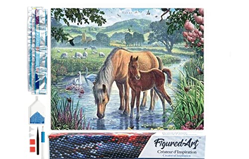 Figured’Art Diamond Painting Broderie Diamant 40x50cm Toile Entière Roulée avec Strass Perles Carrés - Chevaux et Ruisseau - Kit Complet Cheval 5D DIY Activité Manuelle Loisirs Créatifs Adultes
