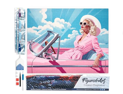 Figured’Art Diamond Painting Broderie Diamant 40x50cm Toile Entière Roulée avec Strass Perles Carrés - Diva dans une Voiture Rétro Rose - Kit Complet 5D DIY Activité Manuelle Loisirs Créatifs Adultes