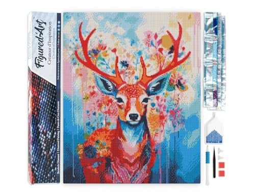 Figured’Art Diamond Painting Broderie Diamant 40x50cm Toile Entière Roulée avec Strass Perles Carrés - Cerf coloré en fleurs - Kit Complet 5D DIY Activité Manuelle Loisirs Créatifs Adultes