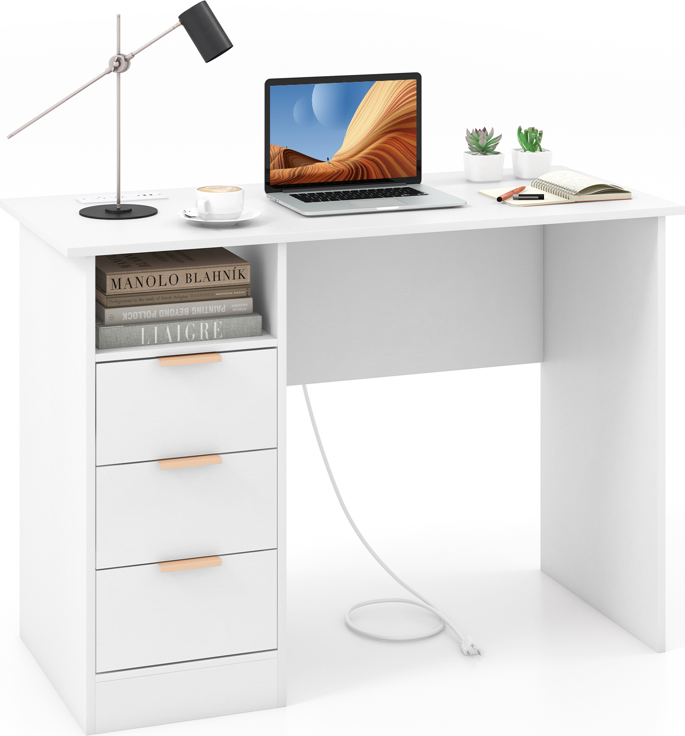 COSTWAY Bureau 108x60x125 cm avec station de chargement, petit bureau informatique avec prise de courant, rehausse et compartiments ouverts, table de bureau en bois, table PC blanche