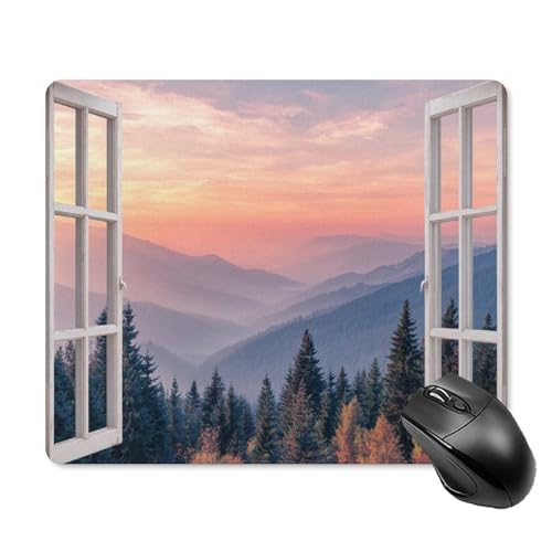 Jubonexis Tapis de souris avec cadre de fenêtre, montagnes, arbres, lever de soleil, petit ordinateur de bureau, ordinateur portable avec base en caoutchouc antidérapant, tapis de souris de jeu