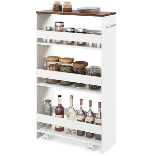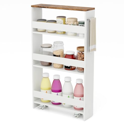 COSTWAY Chariot de Rangement 13 cm à roulettes, Desserte de Cuisine Etroit à 4 Niveaux avec Poignée Latérale et Roues Universelles avec Freins, Design Étroit pour Petit Espace (Blanc+ Naturel)