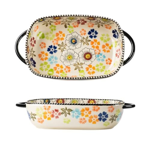 HLHLOP777 Plat à Four Moule à pâtisserie Double poignée en céramique Peint la Main, Motif Floral coloré, carré, for Four Micro-Ondes, Poulet rôti Plat à Lasagne(Petit)