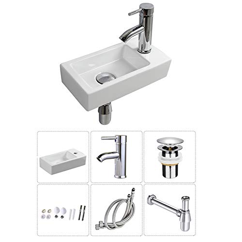 Eridanus Lavabo de salle de bain, à suspendre au mur, rectangulaire, en céramique, blanc, peu encombrant, avec robinet droit pour lavabo, garde-robe, toilettes, petit lavabo moderne, à poser (bac