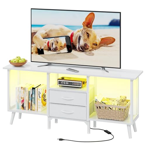 OYRREU Meuble TV, Meuble TV Salon avec Éclairage LED, Petit Meuble Télévision 120 cm, 2 Tiroirs de Rangement, pour TV 55 Pouces, Idéal Chambre et Salon - Blanc