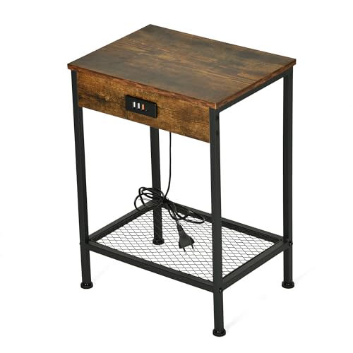 Meuble Cosy Table d'Appoint avec Station de Charge et 4 Ports USB Bouts de canapé Design à 2 Niveaux Guéridon Meuble Salon, Chambre Petit Espace, Marron, 38x28x52cm