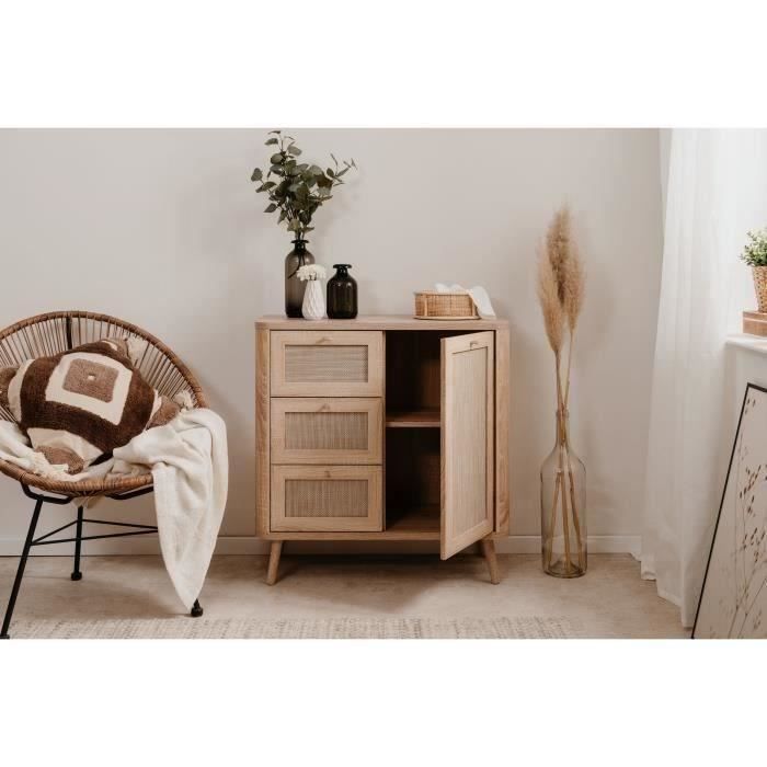 Petit meuble de rangement - 3 tiroirs - 1 porte - Décor Cannage - L809 x H84 x P40 cm