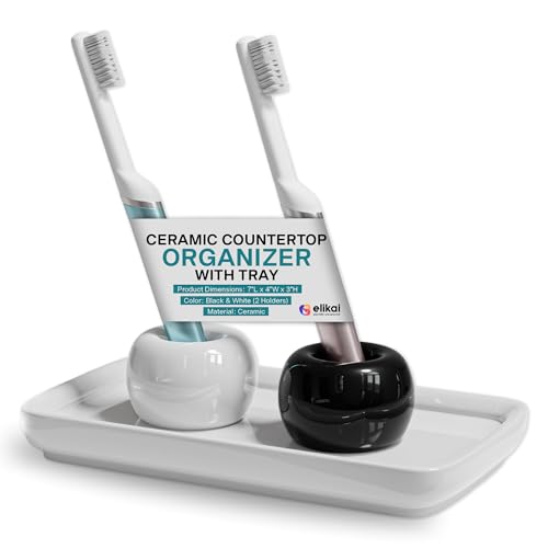 Porte-brosse à dents en céramique avec plateau pour comptoir de salle de bain, petit support de brosse à dents, rangement minimaliste de salle de bain et organisateur de brosse à dents unique (noir et