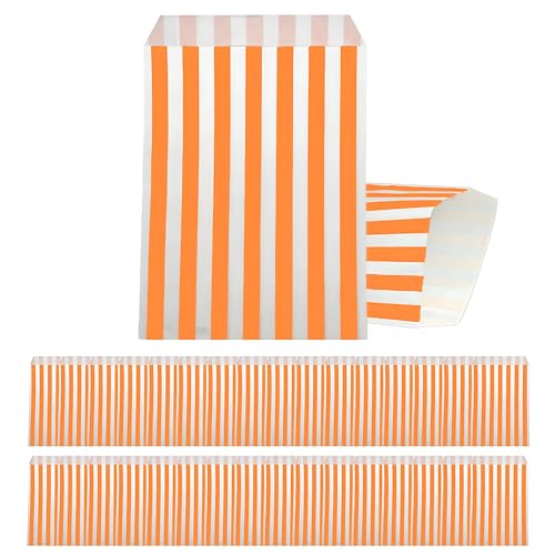 100 pièces Orange Rayures Sac Cadeau Sachet Bonbons Anniversaire,12.7cmx17.8cm Petit Pochette Papier Kraft pour Emballage Cadeau Garçon Fille,pour Anniversaire Enfants,Mariage,Noël,Fête,Halloween