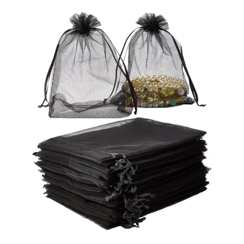 BEAMARKER 50 Sachet en Organza Noir Petit Sachet en Maille Transparente de 18x13cm Pochette Cadeau avec Cordon de Serrage Pochette Rectangulaire en Organza pour Le Rangement des Bijoux Emballage