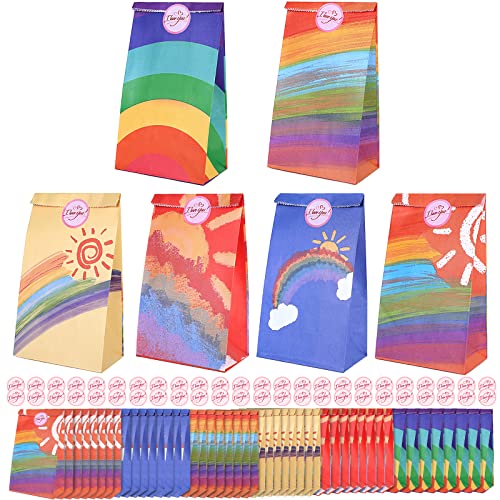 Romon Sac Cadeau,24 PCS Pochette Cadeau Arc en Ciel Kraft Sac avec 24 Autocollants, Sachet Bonbons Anniversaire Sac Cadeau Petit Format pour Mariage, Anniversaire, Noël, Halloween,Party
