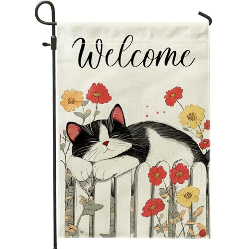 Drapeaux de jardin en bois pour chat - 30,5 x 45,7 cm - Double face pour l'extérieur, fleurs kawaii - En toile de jute standard - Pour jardin, petite maison, décoration extérieure