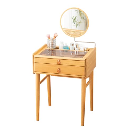 Coiffeuse de maquillage en bambou avec miroir rotatif, petite commode moderne avec plateau en verre trempé et 2 tiroirs, coiffeuse élégante pour chambre à coucher et dressing