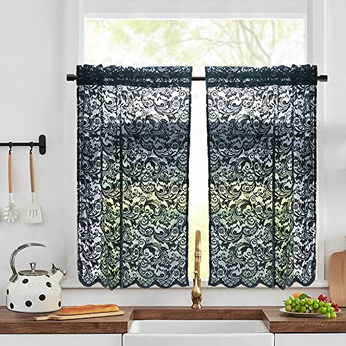 Aligogo Lot de 2 Rideaux Courts en Dentelle Noire, avec Passe-Tringle, Style élégant et Gothique pour Petite fenêtre de Cuisine, Chambre, Salle de Bain, décoration bohème/Halloween, 91,4 cm de Long