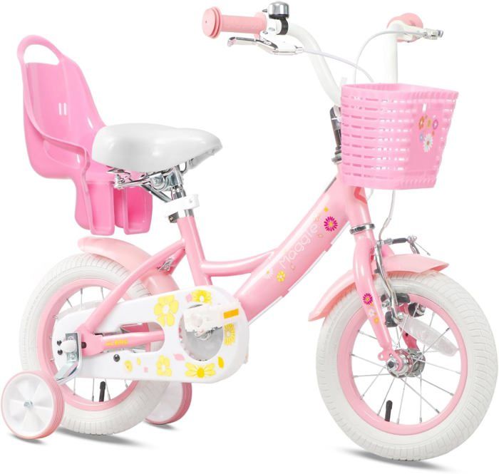 Glerc 12 Pouces vélo pour Enfants pour 12, 3, 4 Ans Petite Fille Mignon vélo avec Roue de Support de Panier et Cloches Rose
