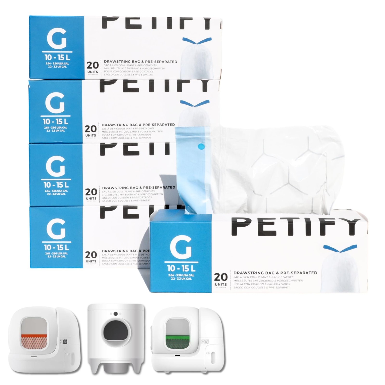 PETIFY Sac Poubelle pour Litière Automatique Chat - Compatible Petkit Pura Max 2, Pura X - Lot de 5 Rouleaux (100 Sacs Pré-Séparés) Résistantes avec Cordon Code du Sac G Éco Pack avec Dévidoir Intégré
