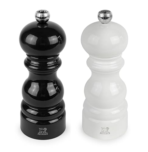 PEUGEOT - Duo Paris - Moulin à Poivre + Moulin à Sel 15 cm - Réglage Classique - Bois Revalorisé Labellisé PEFC - Fabrication Française - Coloris Noir & Blanc