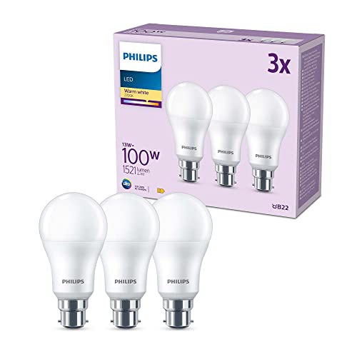 Philips Lot de 3 ampoules LED givrées A60 [Blanc chaud 2700 K – Culot à baïonnette B22] 100 W, non compatible avec variateur d'intensité pour éclairage intérieur et maison