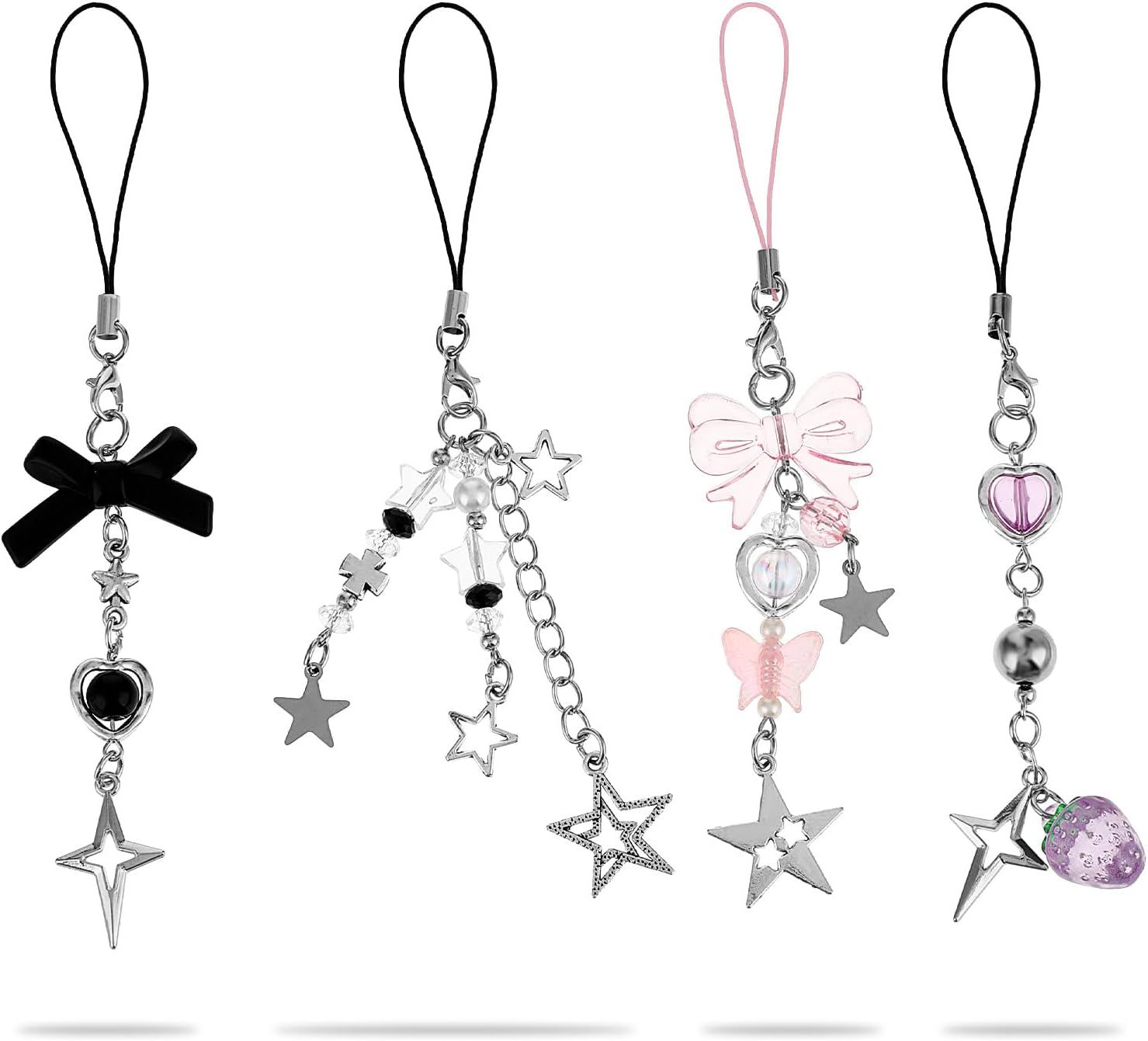 4pcs Cute Cell Phone Charms Phone Jewelry Set Pink Strawberry Butterfly Star Charm Cell Phone Charm Key Chain Camera Decoration