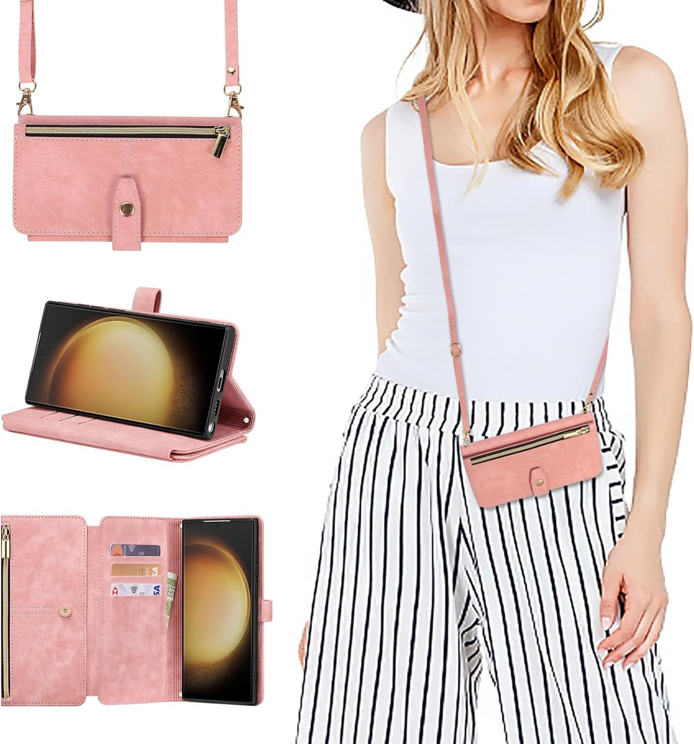 Case For Samsung Galaxy S24 Ultra With Band, Leather Phone Case Practical Cell Phone Chain Card Holder Wallet Case For Samsung S24 Ultra, Rose Gold