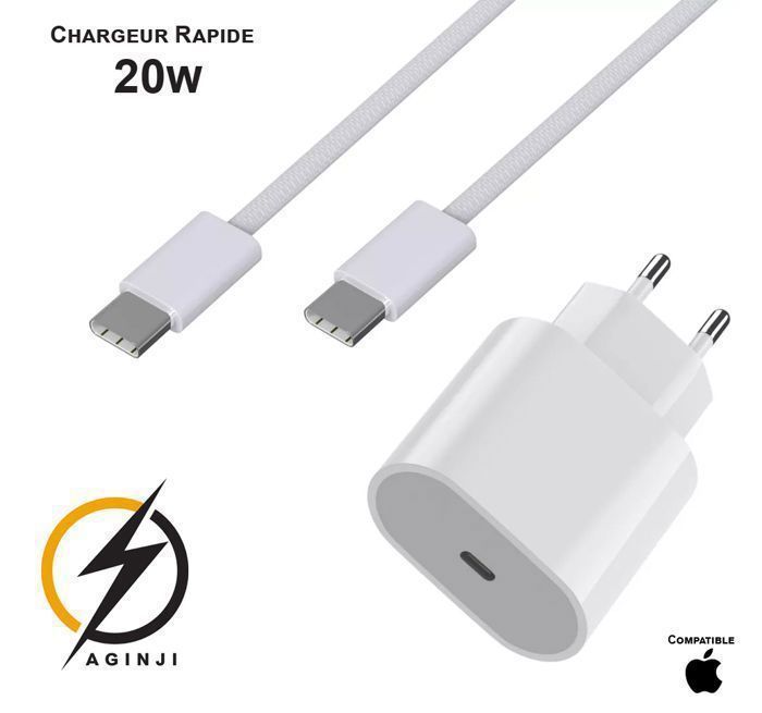 Chargeur rapide 20W + cable USB-C vers USB-C 1M pour iPhone 15/ iPhone 16/ iPhone 17 Aginji® Store France