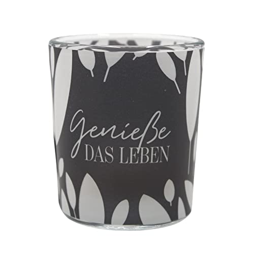 Photophore en Verre avec Motif sur Une Banderole Transparente, Design Noir et Blanc, sel et Poivre, avec 1 Bougie Chauffe-Plat, Hauteur 6,5 x 6 cm, Motif : Profitez de la Vie