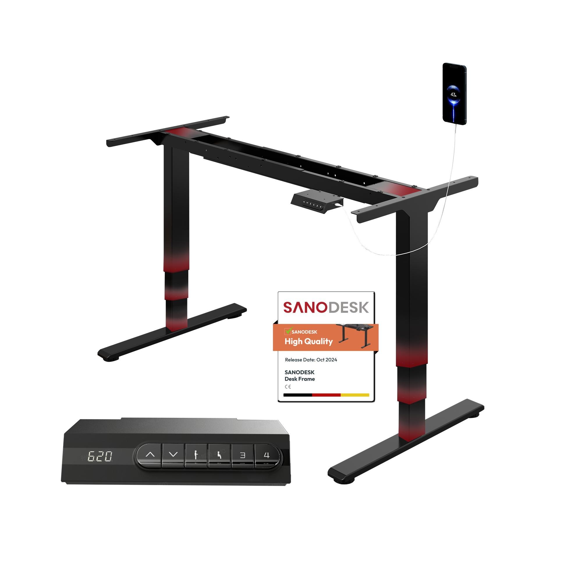 SANODESK Pied de bureau réglable en hauteur, électrique avec 2 moteurs, USB A/B, capacité de charge 120kg, 4 fonctions de mémoire, anti-collision Noir
