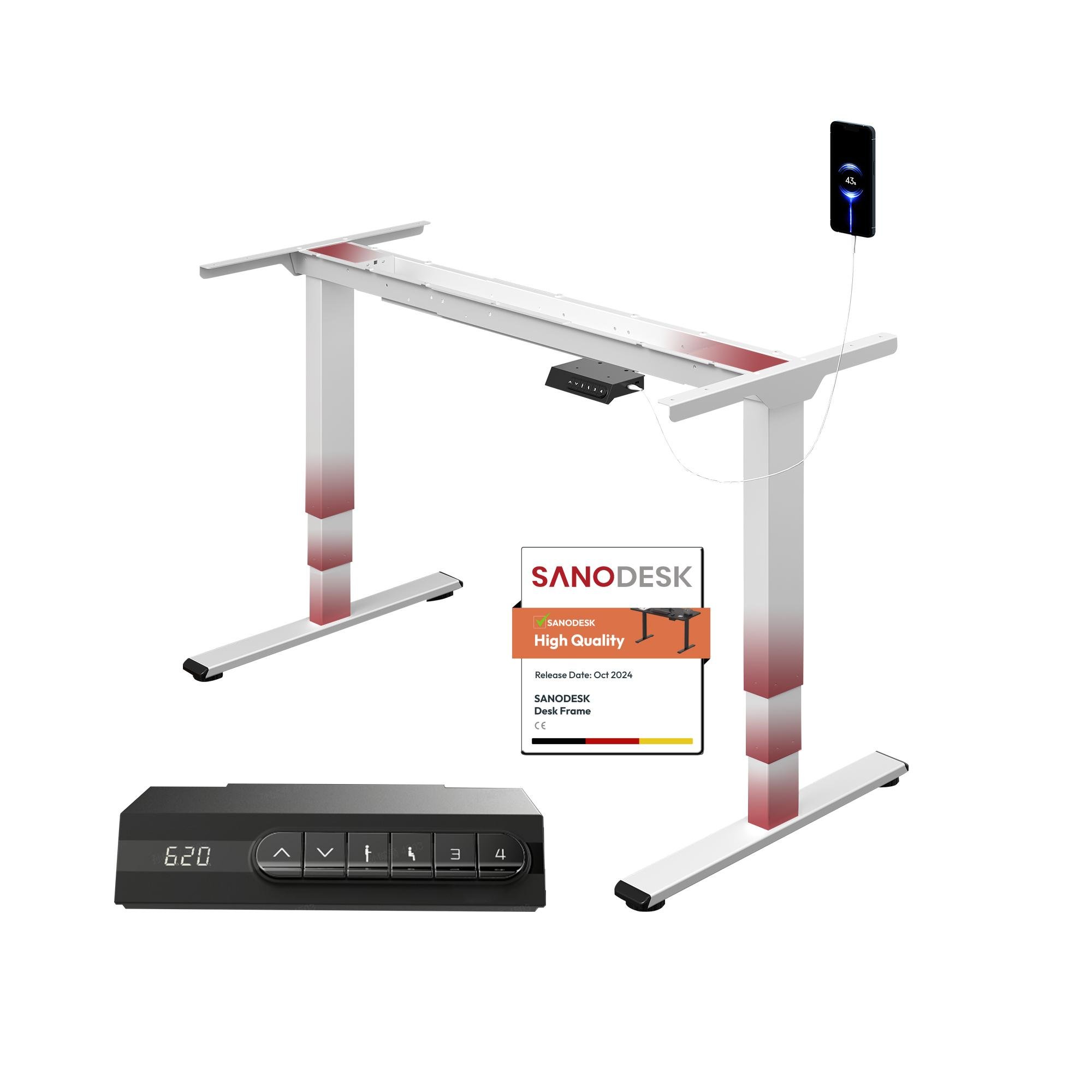 SANODESK Pied de bureau réglable en hauteur, électrique avec 2 moteurs, USB A/B, capacité de charge 120kg, 4 fonctions de mémoire, anti-collision Blanc