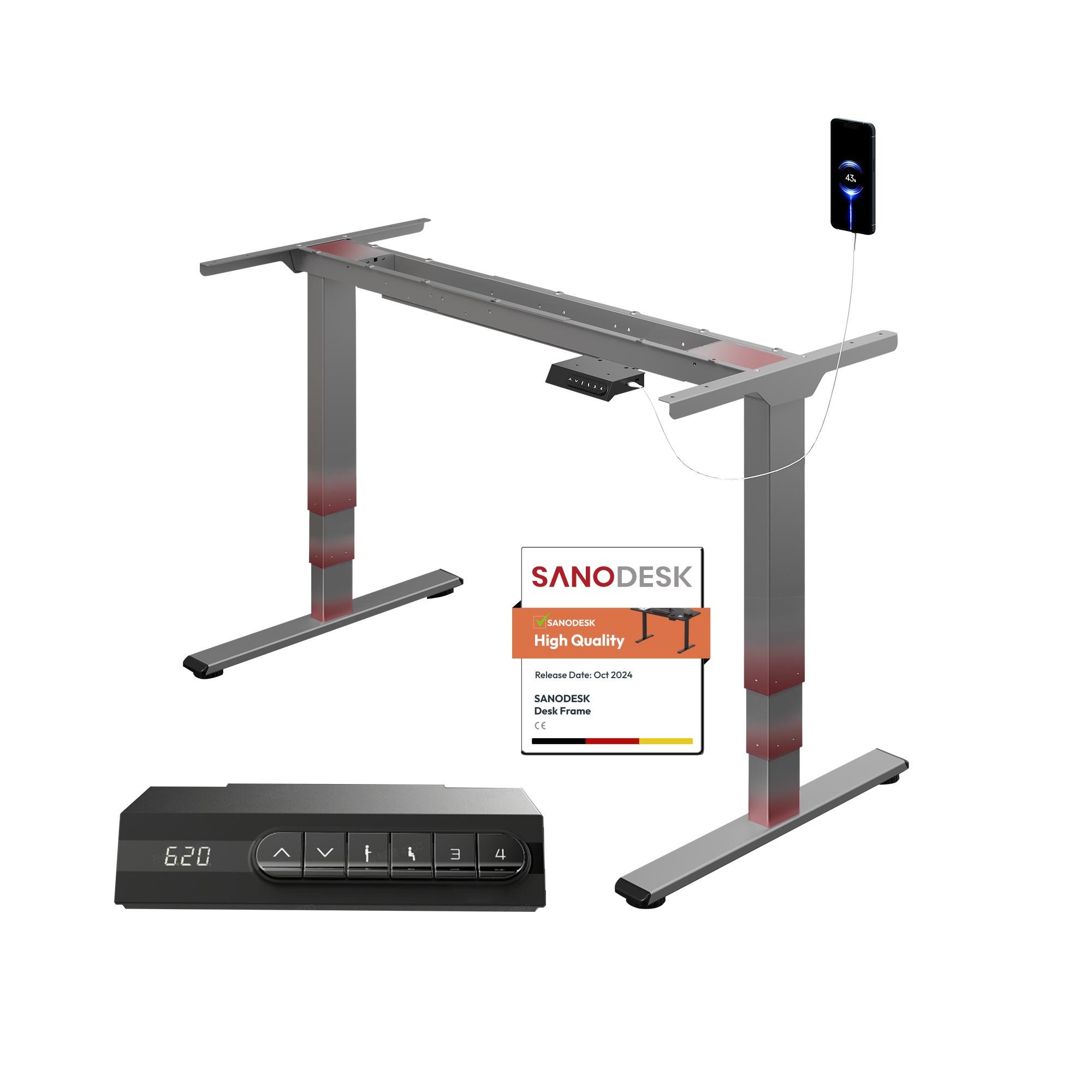 SANODESK Pied de bureau réglable en hauteur, électrique avec 2 moteurs, USB A/B, capacité de charge 120kg, 4 fonctions de mémoire, anti-collision Gris