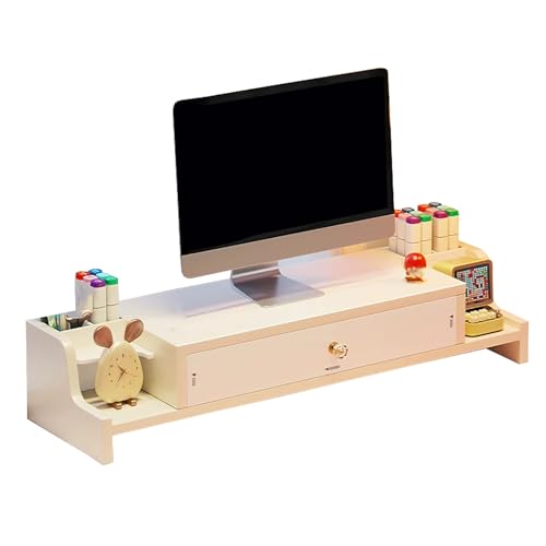 Support Ecran pc en Bois Massif avec Tiroir et étagère Coulissante – Pied Ecran Pc pour Ordinateur Portable, Rehausse L'écran de 15 cm(White,Small)