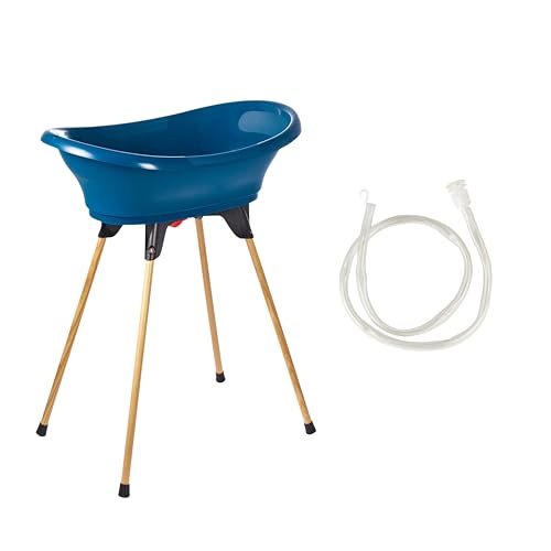 THERMOBABY - Kit Baignoire Bébé - Vasco - Baignoire, Pied En Bois & Tuyau De Vidange - Innovation Brevetée - Pliable & Stable - Peut Accueillir Un Transat De Bain - Fabriqué En France - Bleu Océan