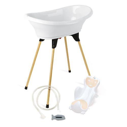 THERMOBABY - Pack Baignoire Bébé VASCO 5 En 1 - Baignoire, Pied En Bois, Tuyau De Vidange, Transat De Bain, Thermomètre - Blanc Muguet - Pliable & Stable - Fabriqué En France
