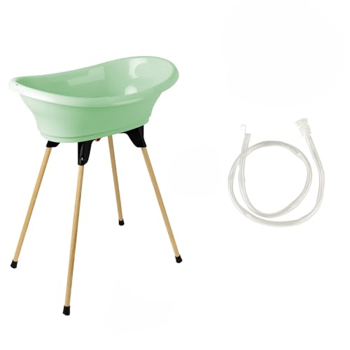 THERMOBABY - Kit Baignoire Bébé - Vasco - Baignoire, Pied En Bois & Tuyau De Vidange - Innovation Brevetée - Pliable & Stable - Peut Accueillir Un Transat De Bain - Fabriqué En France - Vert Céladon