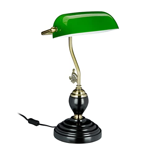 Relaxdays Lampe de banquier, abat-jour en verre inclinable, pied en bois, bureau, E27, rétro, bibliothèque, vert-noir