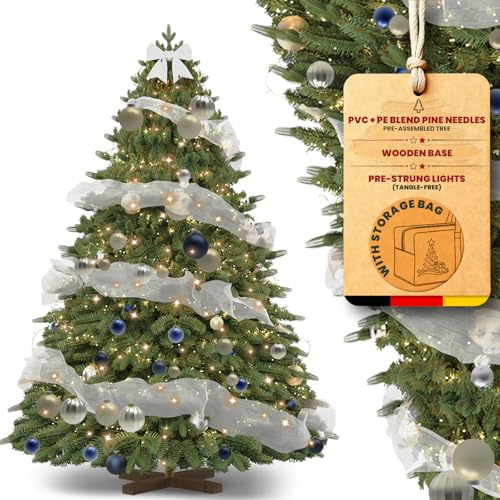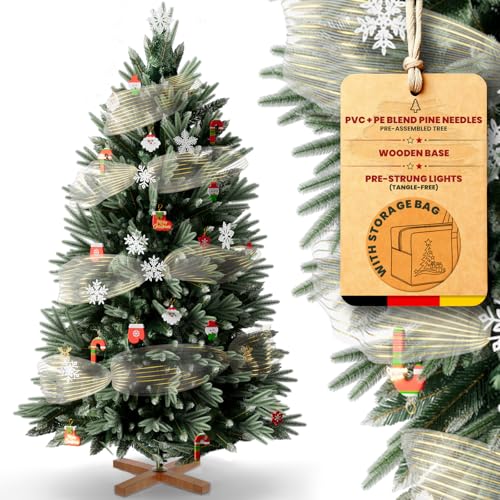 Huracan Sapin de Noël artificiel avec éclairage - 180 cm - Avec pied en bois - Densité PE et PVC - Branches réalistes - Avec kit de décoration et sac de rangement - Vert