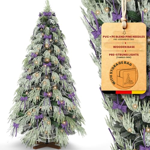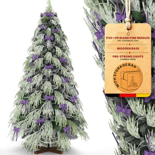 Huracan Sapin de Noël artificiel avec neige, 150 cm, réaliste avec pied en bois, branches denses et festives, avec décorations et sac de rangement, vert