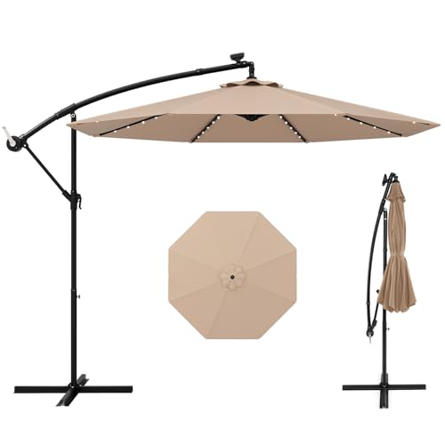 Holamys Parasol déporté avec éclairage LED, 300 cm, taupe, protection UV en polyester, inclinable, rotatif à 360 °, pied en croix stable, pour jardin et terrasse