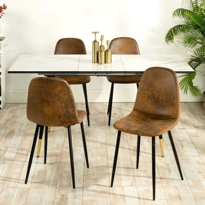 Table extensible effet marbre blanc + 4 chaises simili cuir brun pied noir et doré – URBAN MEUBLE – Ensemble repas rétro chic