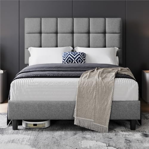 Yaheetech Lit Double Rembourré 140x200cm, avec Tête de Lit Réglable en Hauteur, Cadre de Lits Capitonné avec Sommier à Lattes, Lits pour Adultes 2 Personnes, Pied en Métal, Gris Clair