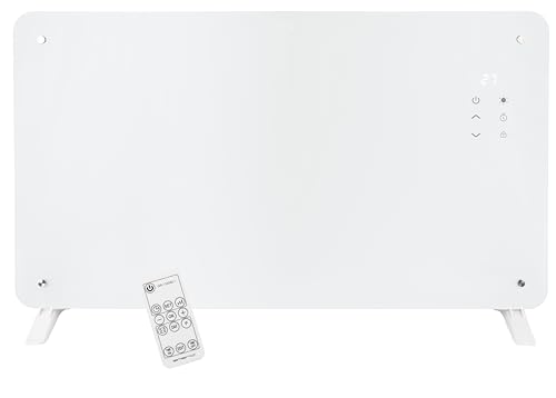 EMERIO Radiateur électrique à convecteur en verre - 76,5 x 47 cm - Télécommande - Chauffage électrique sur pied ou mural - Écran LED - Thermostat 10 à 35 °C - Minuterie 24 h - 2000 W - IP24 - GR